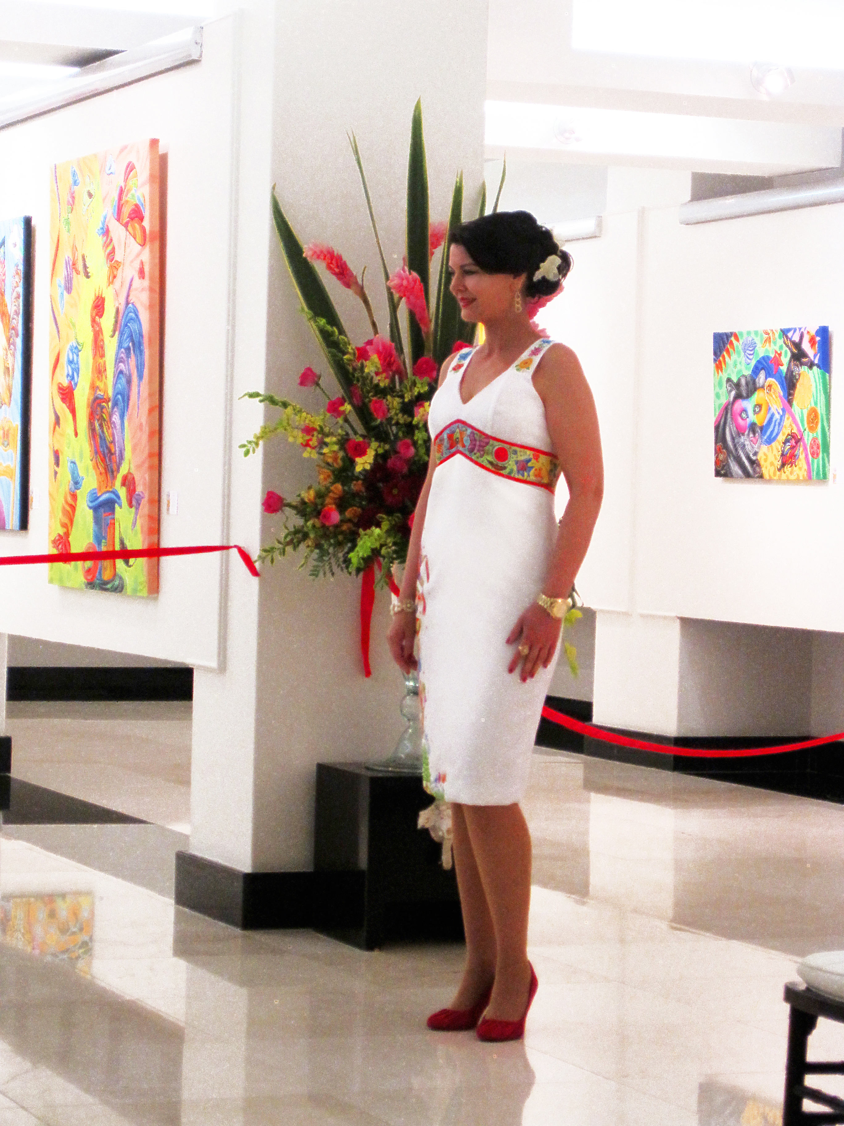 Es grato para mí, después de algunos años, encontrarme con una ex-alumna de la Escuela de Artes Plásticas y más aún darme cuenta que a pesar de haberse casado y logrado criar a dos bellas niñas, ha logrado sacar tiempo para seguir dedicándose al arte a pesar de las diferentes labores que exigen el manejo de un hogar. Manola nos invita a una fiesta, una fiesta de líneas y color, dónde los elementos decorativos juegan alegres y libres dentro del plano, armonías y contrastes nos brindan un mundo mágico de formas, animales, plantas, plumas y flores que se entremezclan para inundarnos de alegría y sensaciones positivas, recordándonos a los fauvistas (también llamados salvajes por el uso de los colores puros). En un mundo globalizado donde la prioridad parece ser la de eliminar y borrar por completo muchas de las especies de la faz de la tierra, por un afán meramente mercantilista, Manola nos entrega un rico menú de animales que nos alimentan no físicamente pero sí espiritualmente y nos invitan a participar de ese carnaval mágico donde el toro salta y nos muestra su bravura al marcar su territorio, corceles que se vuelven mostrando la elegancia y la nobleza que los caracteriza, un gallo que canta para despertar al expectador e invitarlo a participar de la fiesta y otro que se pavonea mostrando orgulloso su hermoso plumaje para la conquista, un flamingo se yergue altanero mostrando su hermoso colorido y el tucán con su gran pico libre y sin temor de ser cazado para satisfacer la visión errónea de algunas personas que gozan de hacer de ellos trofeos para colgar de las paredes. Con todos esos elementos mezclados con frutas tropicales y flores Manola nos regala un coctel digno de disfrutar y satisfacer los más grandes deseos del espíritu y el sentimiento humano.