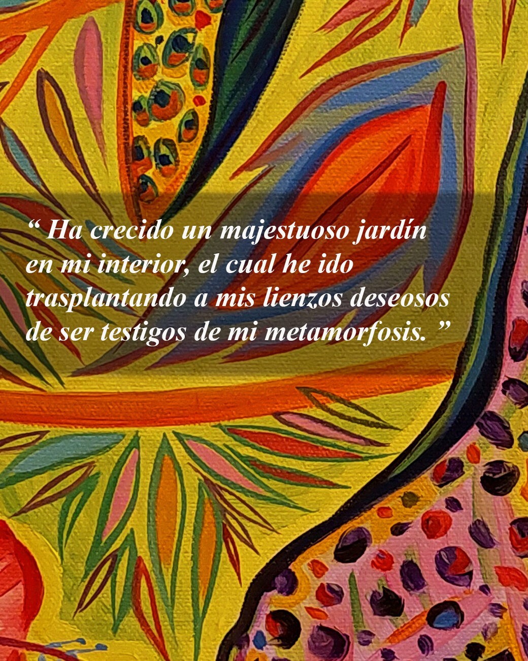 Después de mucho tiempo reencontré a una estimada ex alumna de Artes Plásticas y cuando me mostró sus pinturas, sentí que en ella se daba el maravilloso milagro de la vida de esos árboles que pierden sus hojas y luego llenan sus ramas con la mágica visión de sus flores… Y es que Manola pinta y vive su propia primavera interior, reacción sensible y optimista ante un mundo deshumanizado, donde los verdaderos valores se van extinguiendo. Sus grandes formatos al óleo festejan la vida, pero sobre todo la alegría de vivir con la magia del niño y la madurez de un espíritu que abriga un manantial de esperanzas, donde el sueño se viste de flor, de gesto, de signo depurado y perfecto. Cada una de sus obras regocija la luz que abraza las formas limpias como la fe espiritual… Dicen que las orquídeas florecen por estrés… Pero el alma de esta joven pintora florece por convicción propia, y hoy nos abre sus ventanales y nos invita a entrar y ser felices en un paraíso que estamos perdiendo, pero que aún se puede recuperar: el Edén Interior.